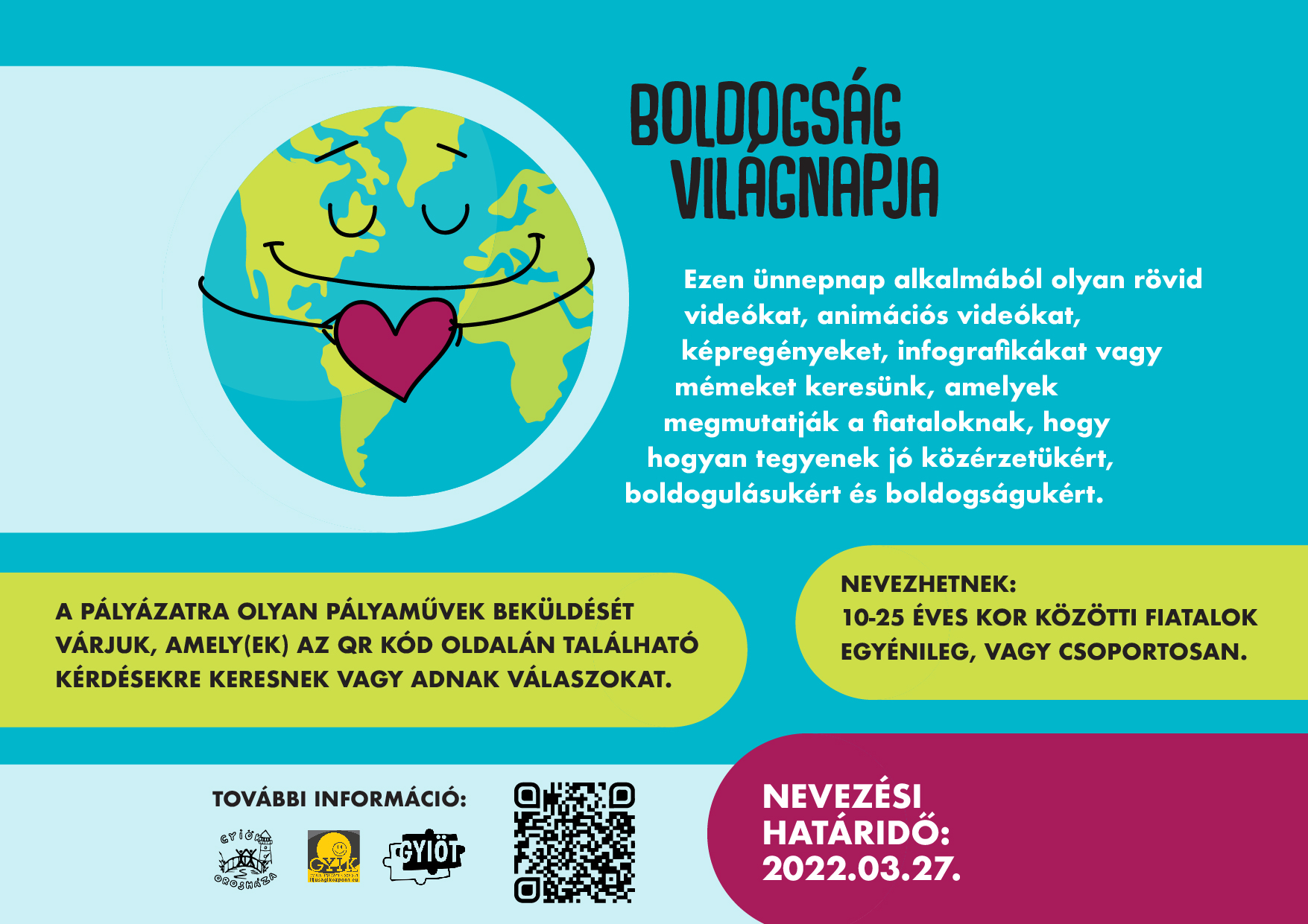 A Boldogság világnapja alkalmából olyan rövid videókat, animációs videókat, képregényeket, infografikákat vagy mémeket keresünk, amelyek tippeket, ötleteket és javaslatokat adnak a fiataloknak ahhoz, hogy saját közérzetükért, boldogulásukért és boldogságukért tehessenek.