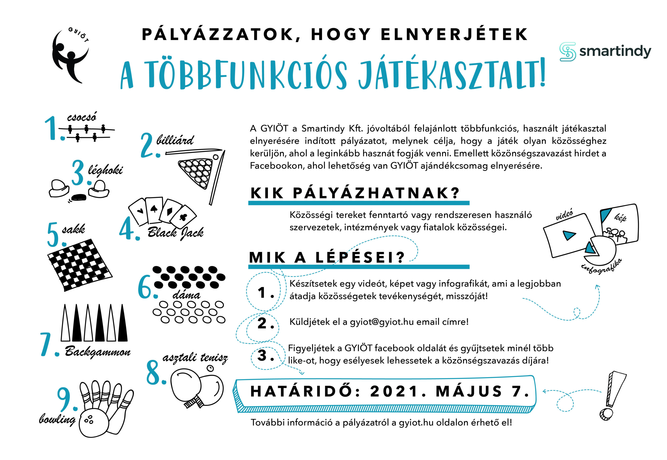 A pályázat támogatója a Smartindy Kft., (Továbbiakban: Támogató), aki főnyereményként 1 db, korábban a munkavállalói által használt többfunkciós játékasztalt ajánl fel, az azt legjobban hasznosítani tudó ifjúsági közösség számára.