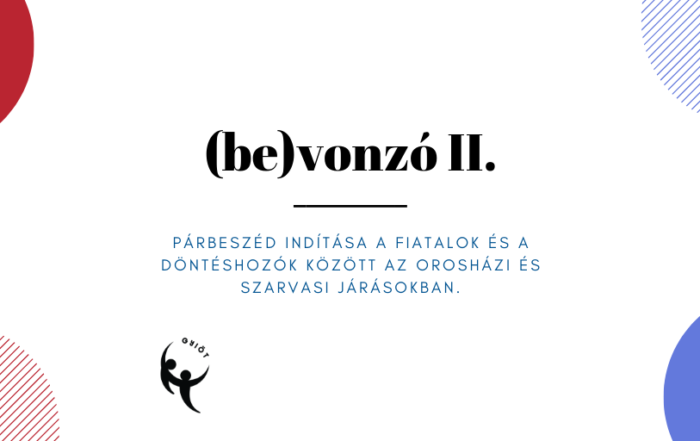 (be)Vonzó? II. című projektünknek célja, hogy az Orosházi és Szarvasi Járások területén, a strukturált párbeszéd módszerének alkalmazásával egy olyan fejlesztési folyamatot indítsunk el, amellyel a döntéshozók és fiatalok között egy aktív kapcsolat kialakulása és működtetése valósul meg. A kapcsolatnak a célja, hogy a fiatalok az őket érintő ügyekkel kapcsolatban a döntéshozatali folyamatokhoz közelebb kerüljenek, a fiatalok véleményének folyamatos becsatornázásának módszerei kialakuljanak. Mindezt a két járás területén közvetlenül bevont településekkel közösen kívánjuk elérni, és kialakítani amely így jó példaként lehet majd a járások többi települése számára is.